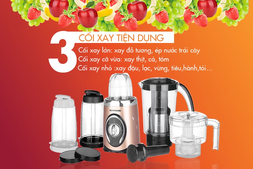 Máy Xay Sinh Tố Đa Năng Sunhouse SHD5326 giúp bạn xay được những nhóm thực phẩm khác nhau. Cối xay lớn nhất kèm bộ lưới lọc bên trong, dành cho việc xay đỗ tương để pha chế sữa đậu nành hoặc ép lấy nước trái cây. Cọc nhồi luôn đồng hành với bộ lọc giúp bạn thuận tiện hơn khi ép trái cây. Cối xay cỡ vừa xay thịt, cá, tôm, để bạn chế biến các món cháo cho bé, thịt băm nấu canh, thịt viên,...Cối xay nhỏ bạn dùng để xay đỗ, đậu, lạc, vừng, tiêu,… hoặc các loại gia vị như hành, tỏi...