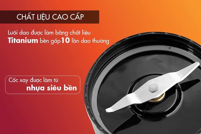 Lưỡi dao được làm bằng chất liệu Titanium bền gấp 10 lần dao thường. Cốc xay thông minh được làm từ nhựa siêu bền, chịu va đập, chịu nhiệt cao, an toàn cho sức khỏe. Đế được làm từ nhựa cao cấp rất rễ cọ rửa nên bạn hoàn toàn yên tâm khi sử dụng.