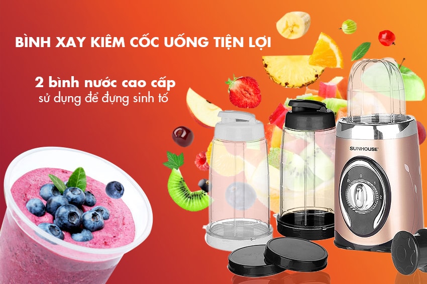 Ngoài ra, sản phẩm còn kèm theo 2 bình nước cao cấp, làm bằng nhựa an toàn với sức khỏe. Bạn có thể sử dụng để đựng sinh tố sau khi xay hoặc đựng nước để sử dụng bên ngoài cũng rất tiện lợi.